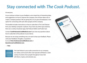The Cook Podcast is your audio connection to our company, our culture, and to each other. Each episode will feature a wide variety of content, from people throughout Cook, that will inform, inspire, and entertain you.