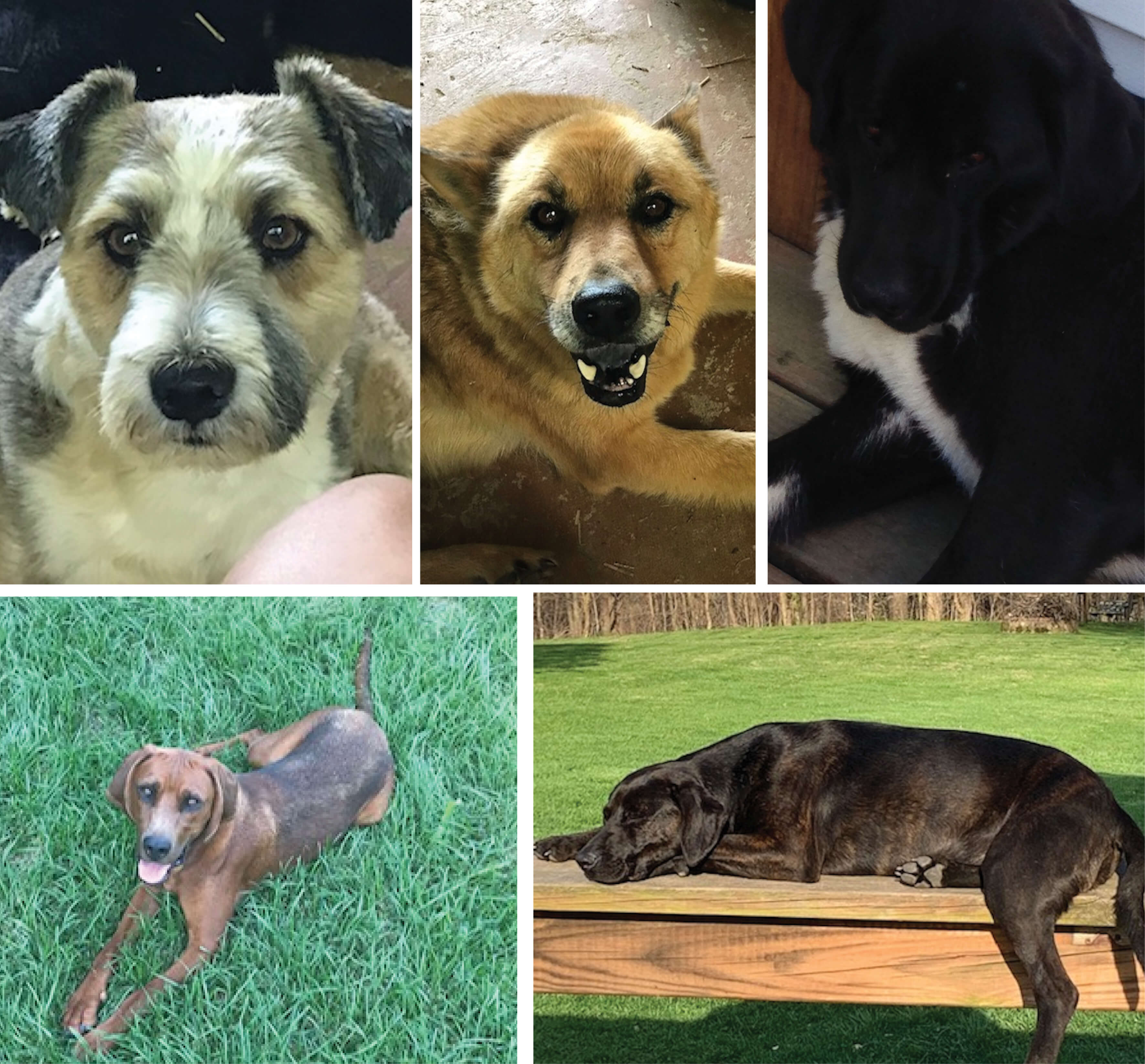 We have 5 beautiful dogs that live on our farm. They are all mutts, and we love them! Their names are: Miss 10, Lester, (AKA the Boss), Butler, Miss 11, and Daisy, (AKA Lazy Daisy).