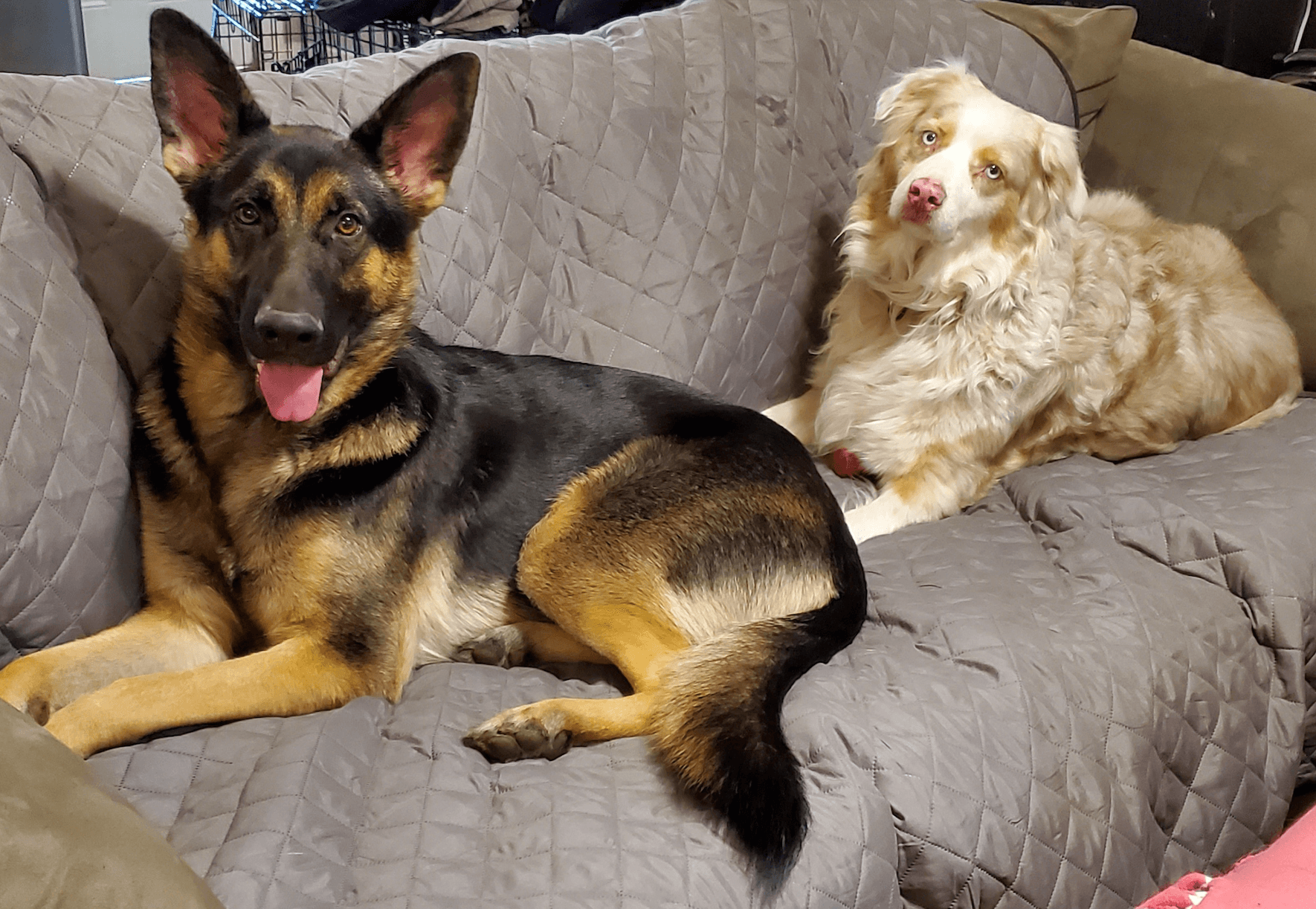 Ares is a 1.5 (ish) year old German Shepard, and Nova is a 5- to 6-year-old (ish) Australian Shepard. They are both rescues and are the best behaved doggos. They both LOVE car rides, meeting new people, and going on adventures. They are the biggest babies and are so loved by us. 😊