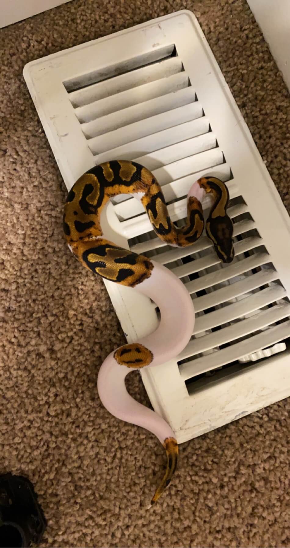 This is my Piebald Ball Python, Baby Bean. He is about 6 months old and maybe a foot and a half.