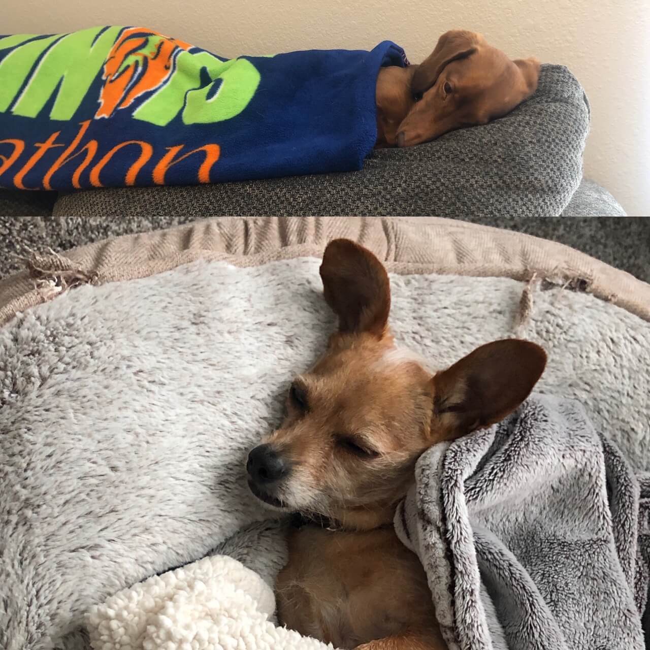 This is Bernie (top) and his brother Babbits (bottom). They like long walks in the park and getting tucked in for their naps.