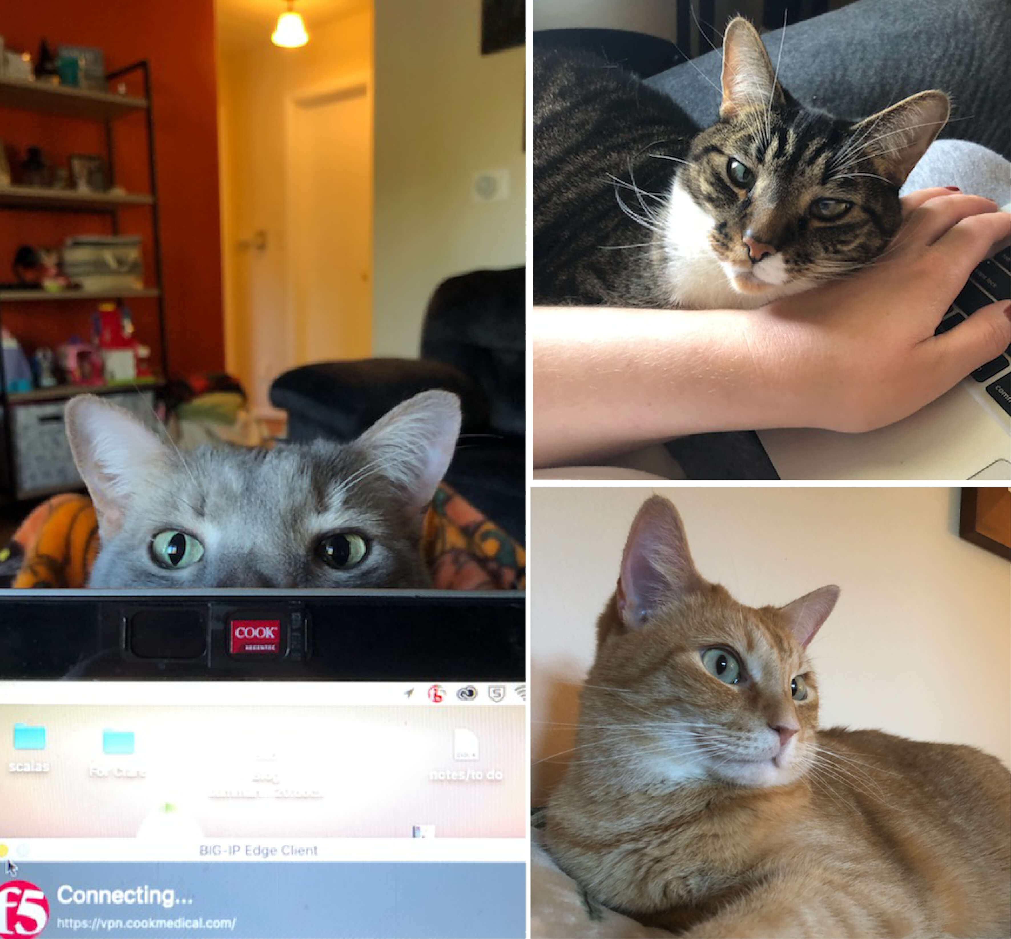 These three cute fur babies are Catniss ,7, (left), Rory, 5, (top right), and Louie, 7, (bottom right). They have all enjoyed helping me work from home over the last several months.