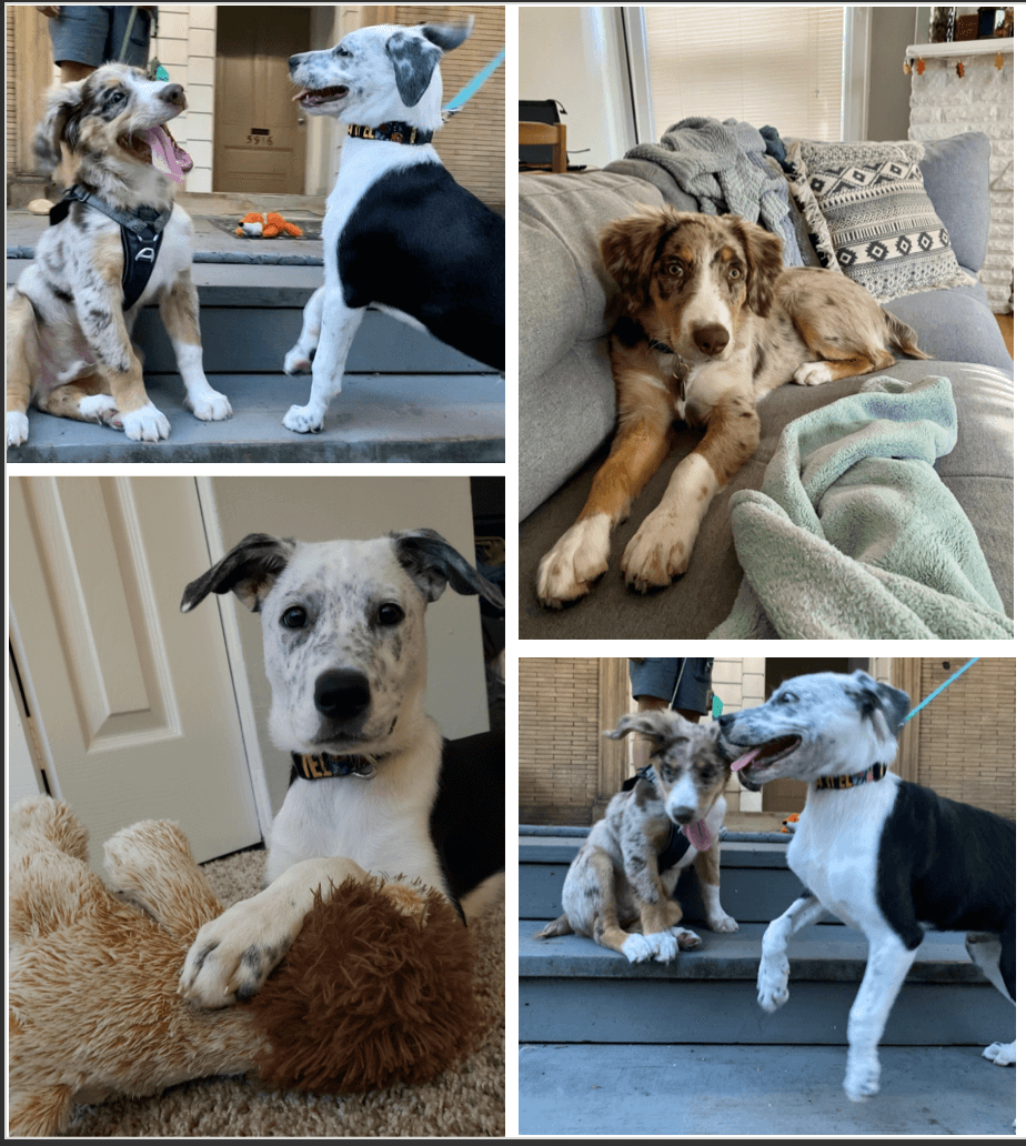 Neither are what might be considered ‘low-energy’ dogs, so their favorite activities consist of chasing each other, puppy fighting, interrupting their parents' virtual happy hours, and making fun of each other’s bandanas and collars that their parents make them wear. They were born on the same day, May 14th. Cooper loves to eat frozen blueberries and doggie ice cream, and Ranger enjoys attempting (and failing) to eat whatever his parents are eating.