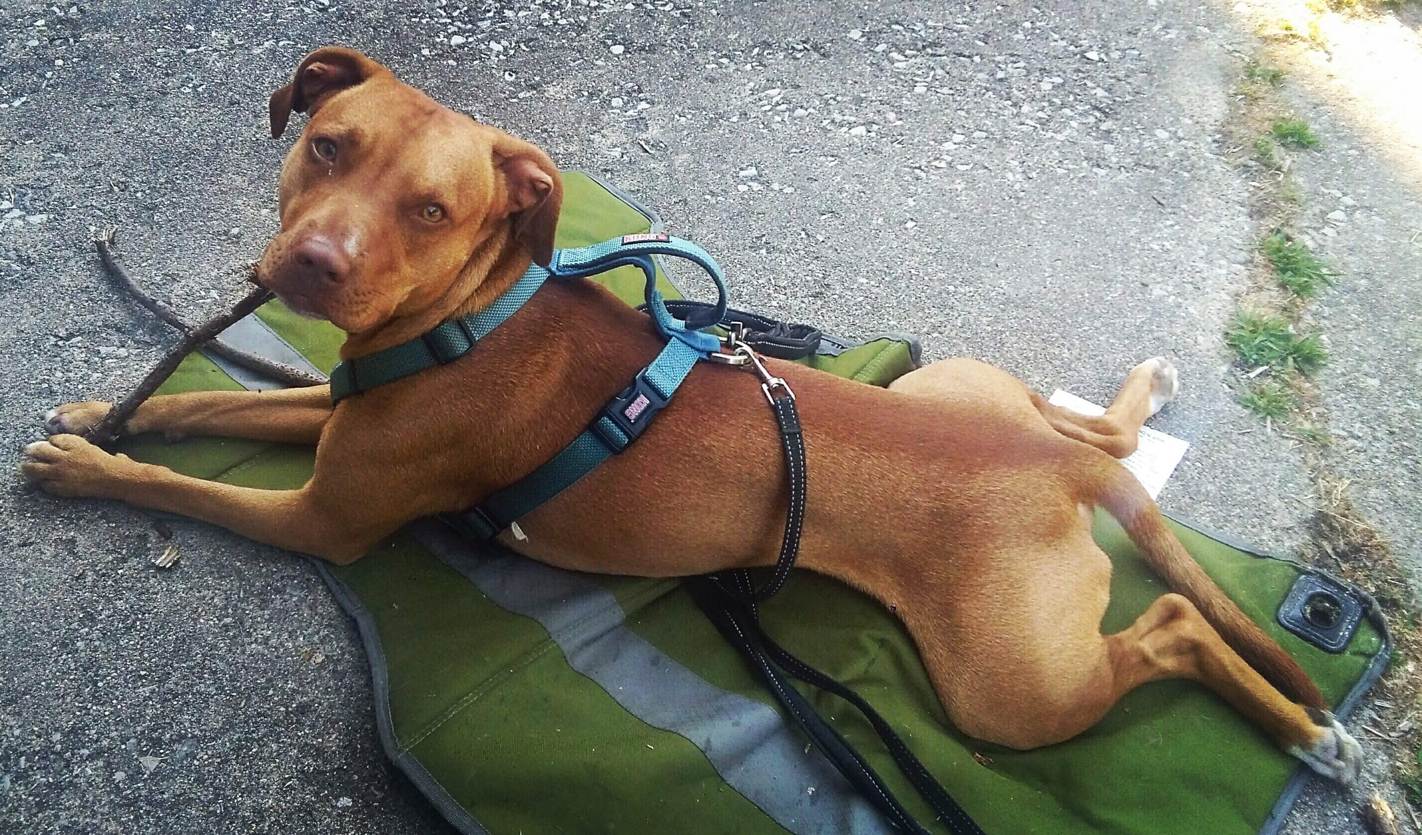 This is Dutch, named after Schwarzenegger’s character in the movie "Predator." He is an American Staffordshire Terrier/Beagle mix. And yes, this is his favorite way to lay when he is relaxing with something to chew on! 😊