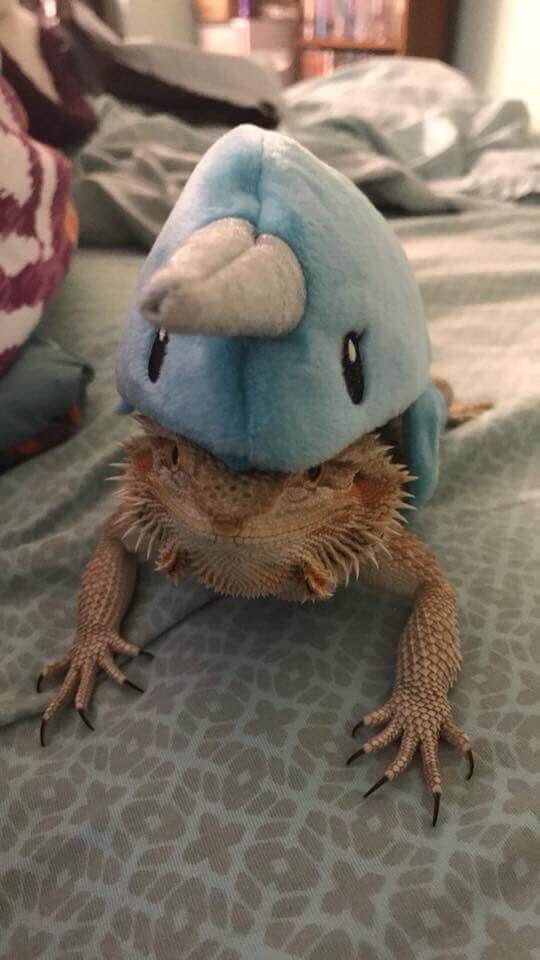 This is my Bearded Dragon, Fidget, ready for trick or treating in her narwhal costume.