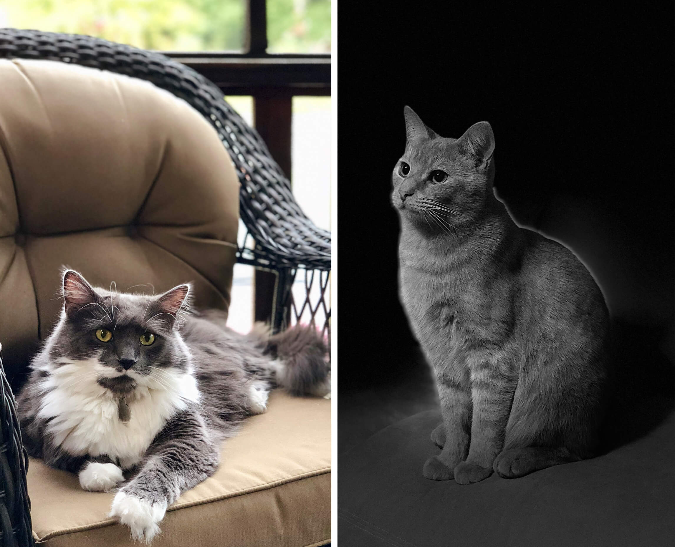 Ivy, left, is a sweet, cuddly, long-haired cutie with a permanent milk mustache. She’s 6 years old and also found her way into my home and heart thanks to the Animal Rescue League. She loves being brushed, sleeping all day on the catio (cat patio), and snuggling up to watch movies.