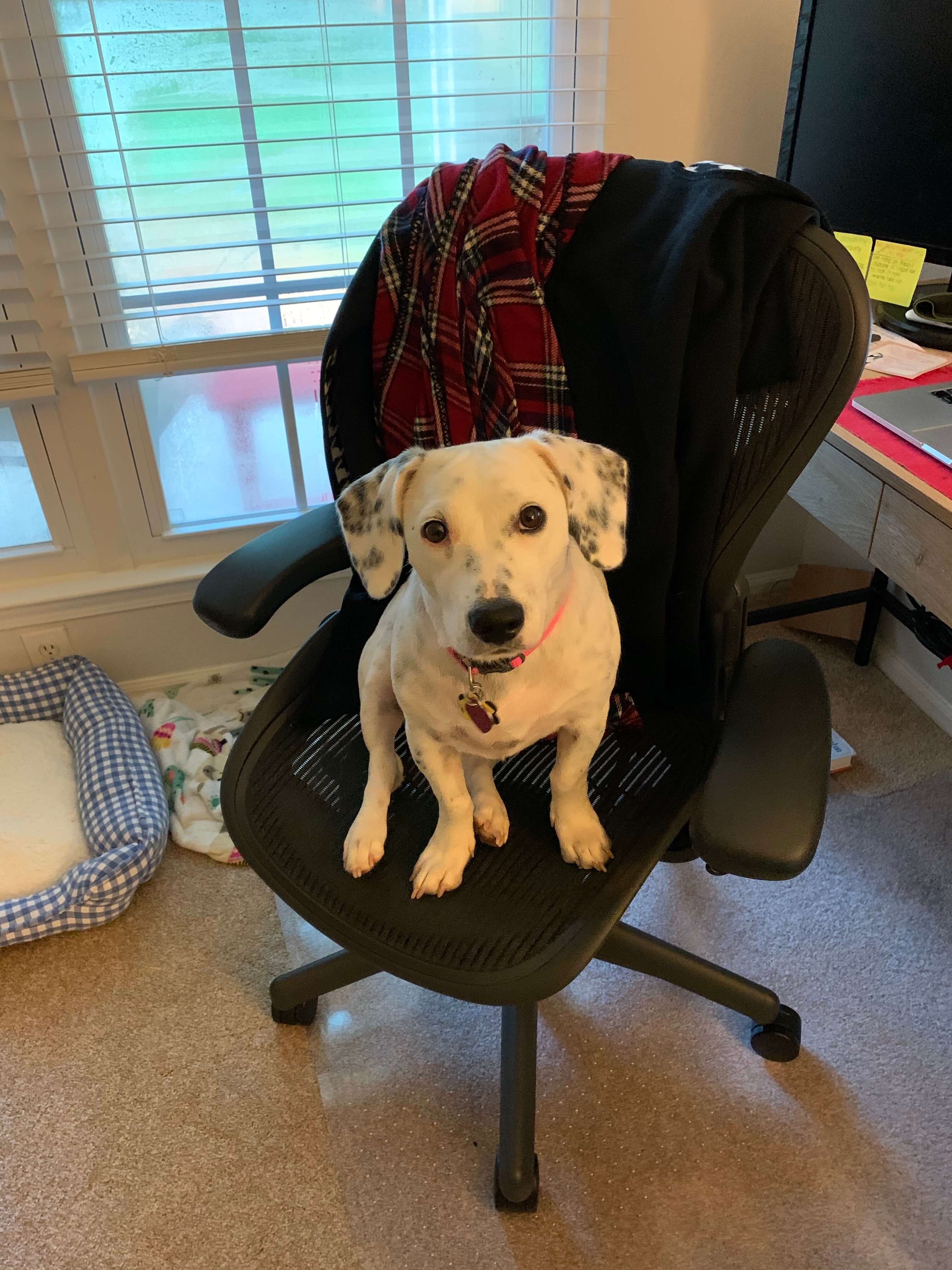 This is LillyAnn. She just had her first birthday in September. We adopted her in July from the Brown County Humane Society. She is sitting at my desk ready to get on a morning call. She likes going to work every day, but is ready to stop right at 5 p.m. She loves going on walks and to the dog park, chasing squirrels up trees, and watching TV. We were told she is a dachshund mix but we have no idea where the spots came from.