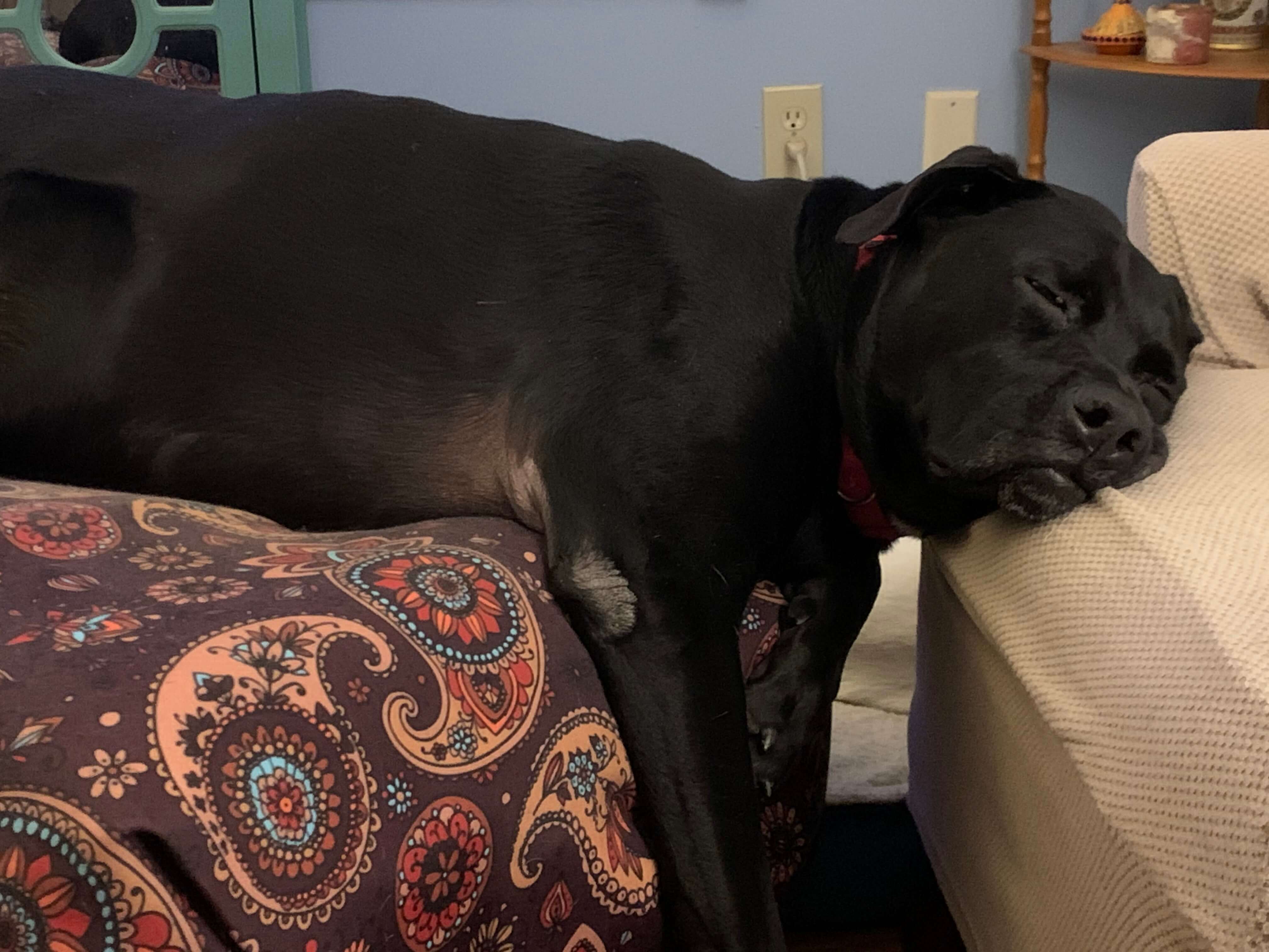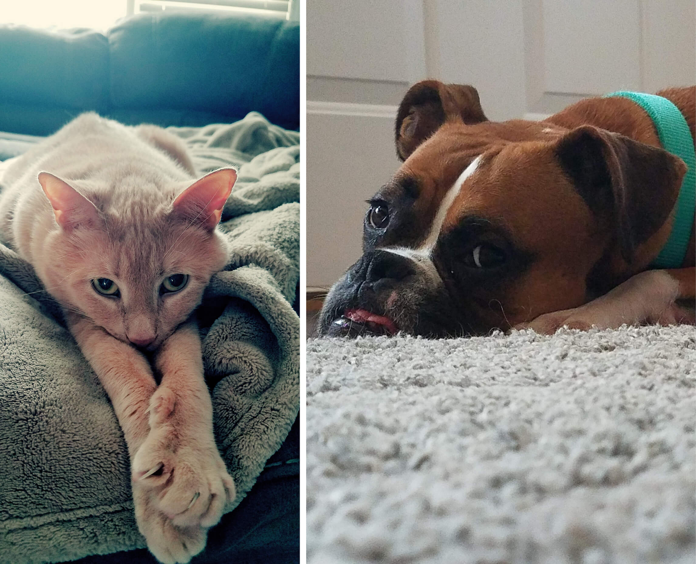 Here is a photo of my 7-year-old cat, Maverick, doing what he does best. Next to him is my 2-year-old boxer, Layla, taking a moment to rest. Clearly, she is annoyed with the photo shoot.