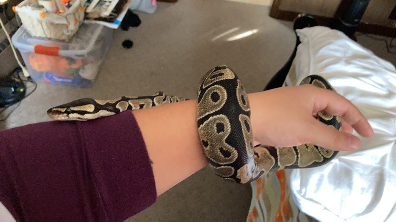 This is my Ball Python, Lonzo! He is the easiest pet I’ve ever had. He loves being held and slithering around on soft blankets. He also loves climbing up my arm like a tree!