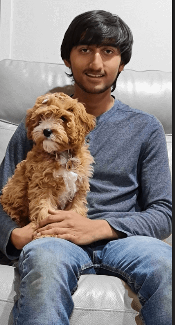 My son with our 4-month-old Cavoodle pup, Lucky.