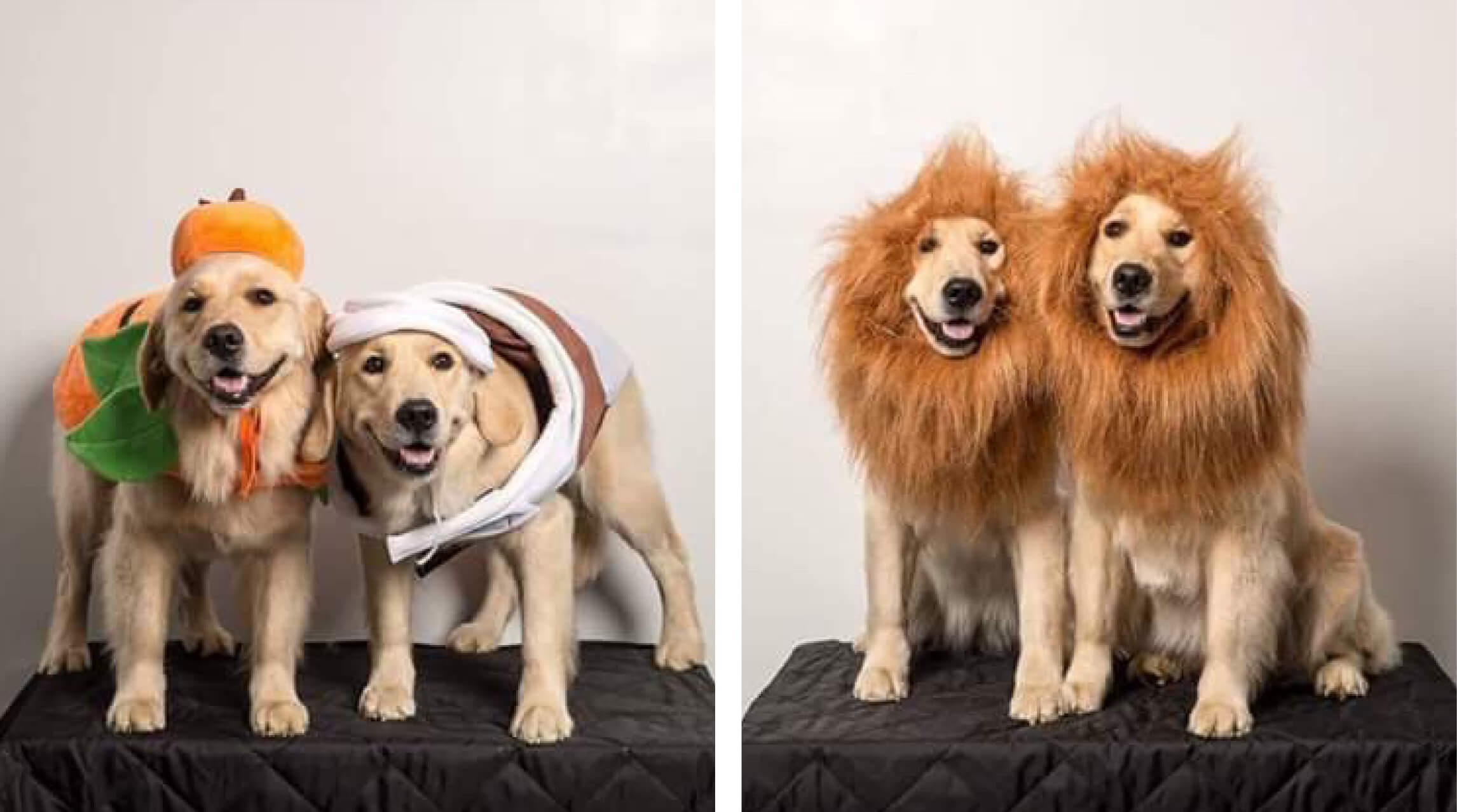 Lucy and Poppy are 3-year-old Golden Retriever sisters. As you can see, they love getting dressed up and posing for pictures. Two of their costumes are ‘pumpkin lattes’ and lions.
