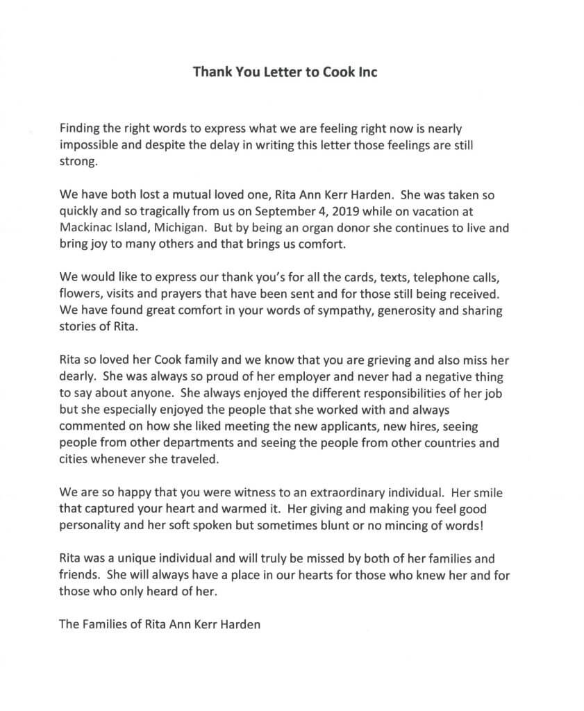 Below is a letter sent to Cook employees by Rita’s families.