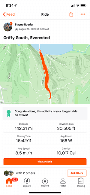 “I was not able to get anywhere near the power numbers I needed to with the hill being so steep. My power numbers and effort required to get up the hill were significantly higher what I had planned for, and I was totally wiped at the end of it,” he said. “There are some pictures that my son took of me afterward. I had this god-awful look on my face, like somebody had beaten me.”