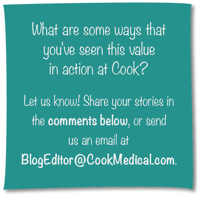 At the end of 2018, Pete Yonkman, president of Cook Medical and Cook Group,Β John Kamstra, chief financial officer (CFO) of Cook Group, Nicky James, Cook Group vice president of Human Resources and Talent Development, and Carol Seaman, Cook Group vice president and chief Ethics & Compliance officer, released a special end-of-year webcast that introduced the updated Cook Group values that we all share as employees. These values are the fundamental beliefs that guide us in the way we work and are the expectations of how we treat each other and our customers. No matter which area of the business you work in, our company values connect us all.